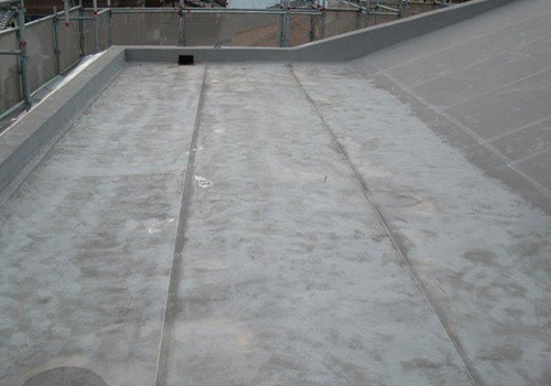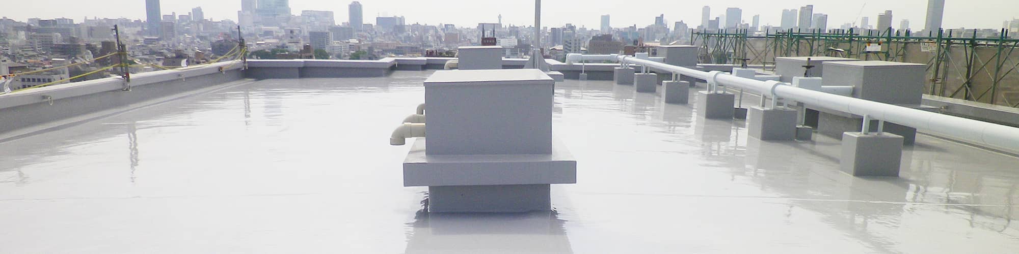 近年、要注目の防水材。強度・耐久性に優れた「ガラス繊維強化プラスチック(FRP)」を用いて、耐水・耐蝕・耐候性に優れた防水層を形成。硬化が早く、工期の短縮に有効。軽量で強靭なので車両走行も可能。